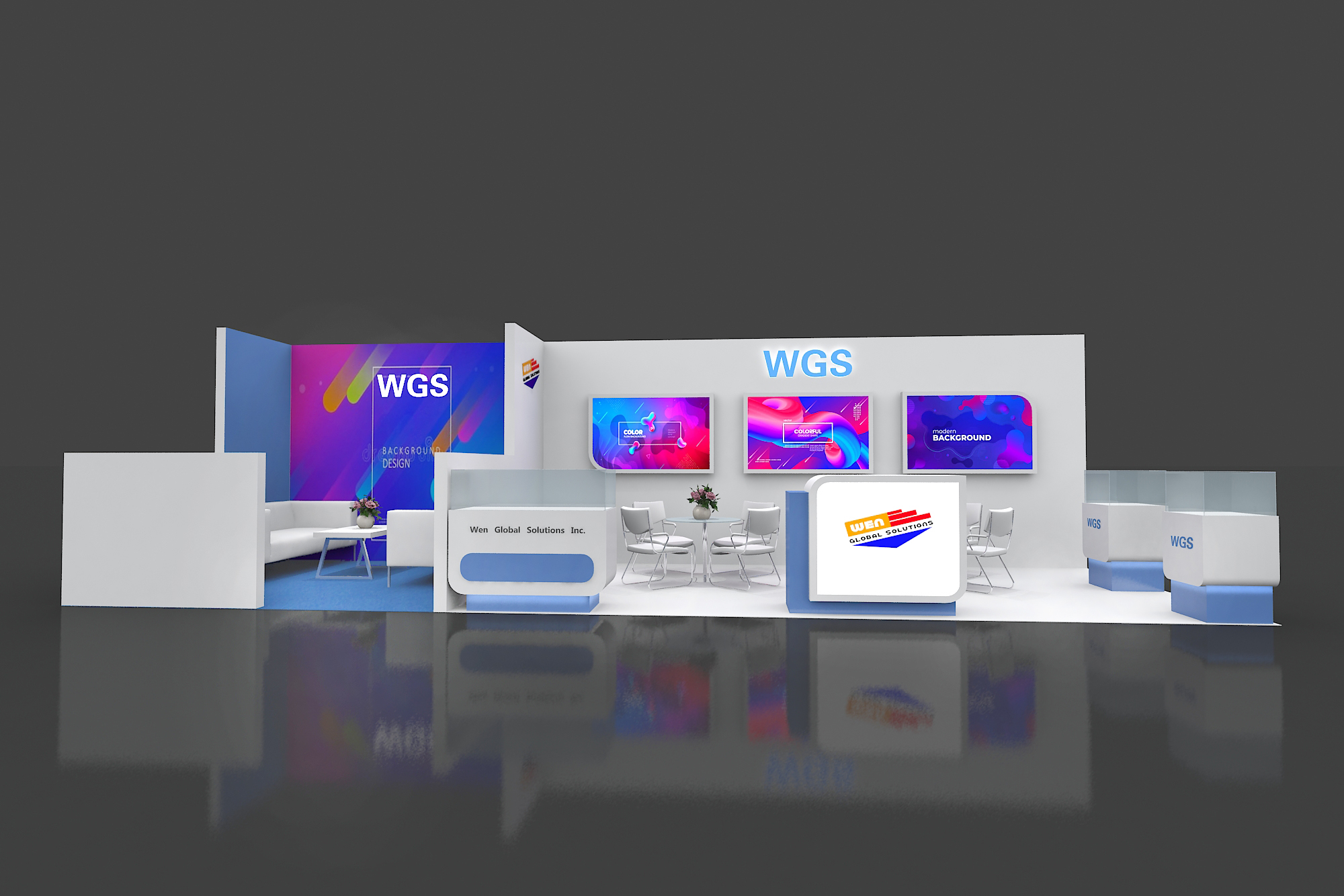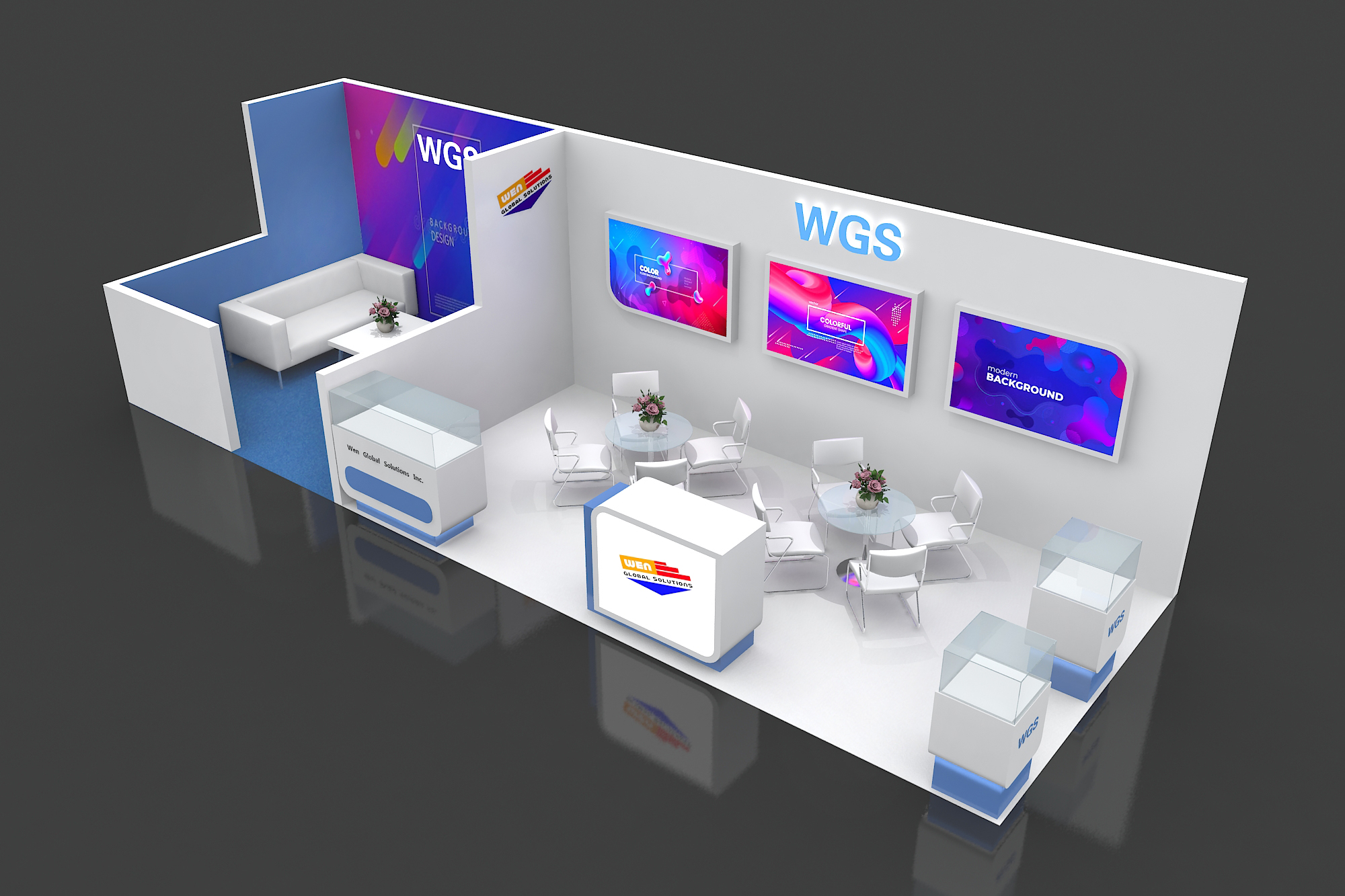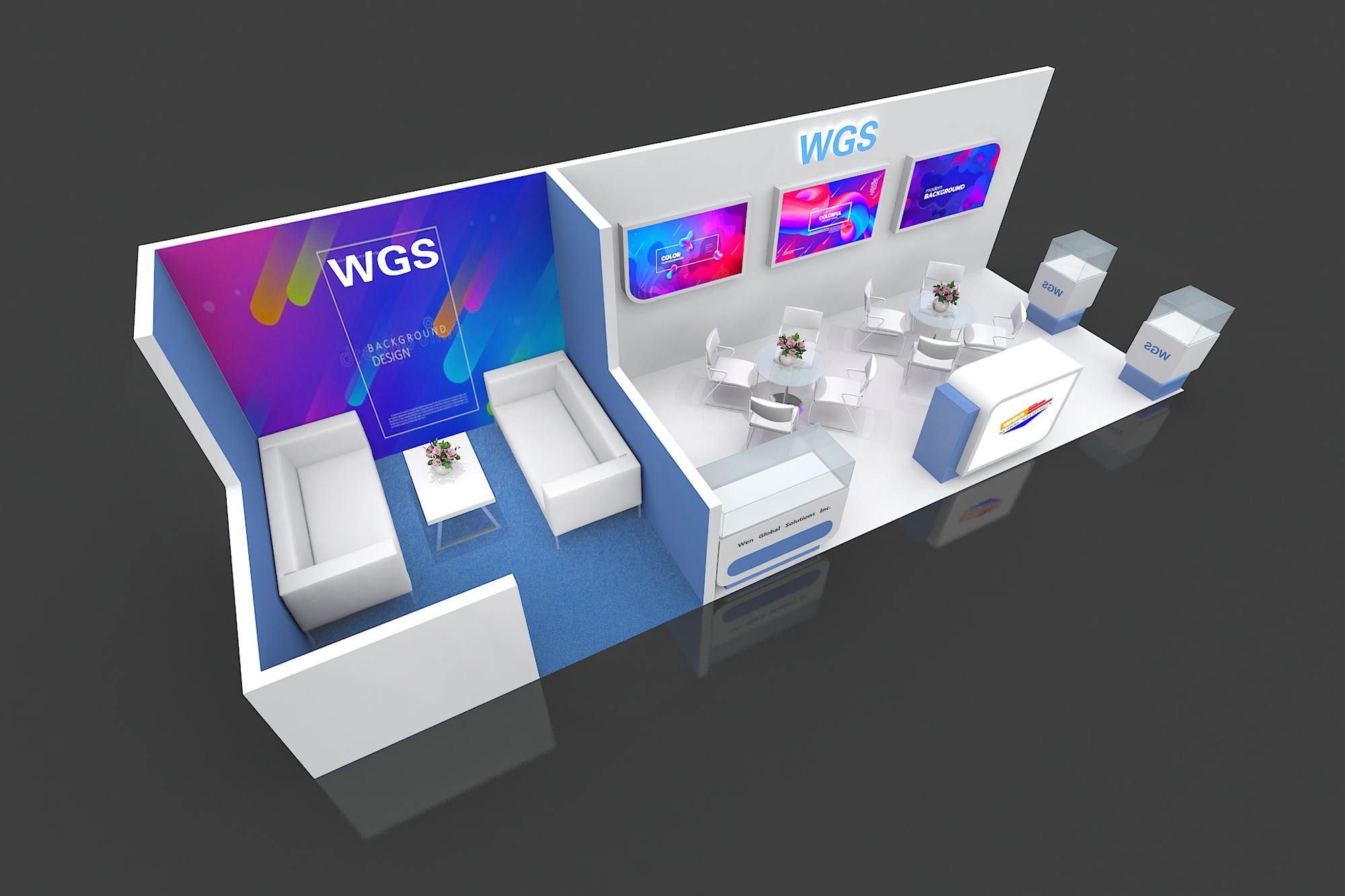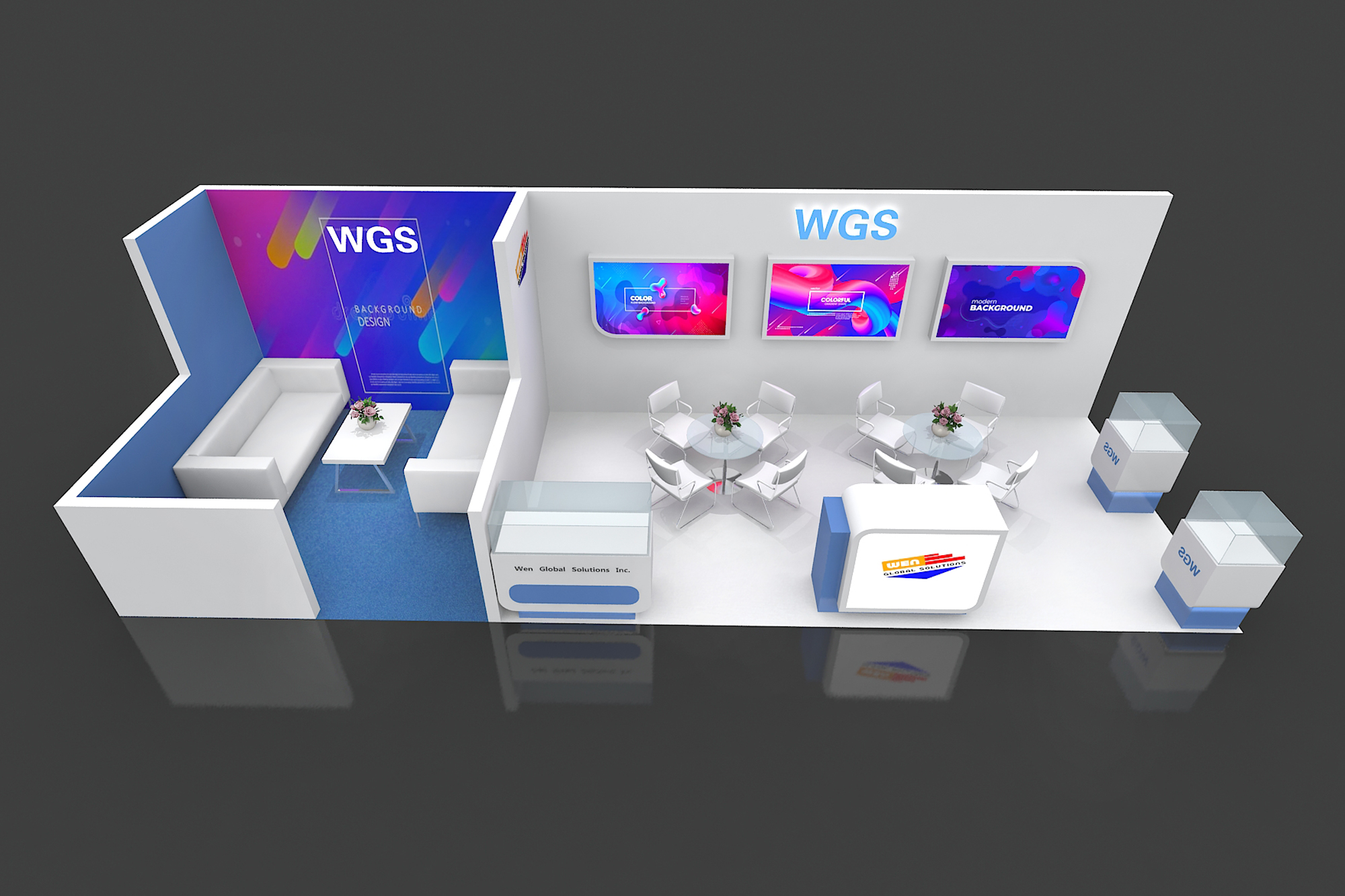 套餐编号: 27-K30 包括: 背景墙、侧墙、3个灯箱、1套发光字、2个玻璃展示台、1玻璃展示柜、8张椅子、2张洽谈桌、2张双人沙发、一个茶几、1个接待台、白色地毯、蓝色地毯、1个垃圾篓、照明用电、展台安装及拆除等等。 ***不含画面设计。 场地费:18,000美元 (下载场地合同) 搭建费:27,800美元 (下载搭建订单)