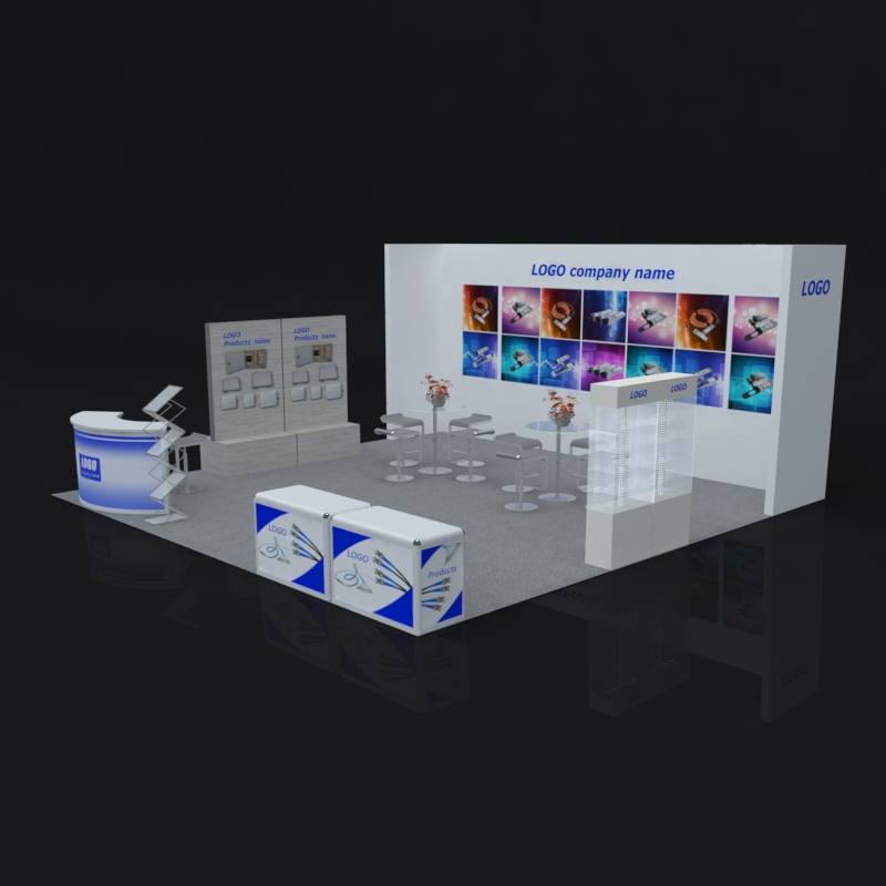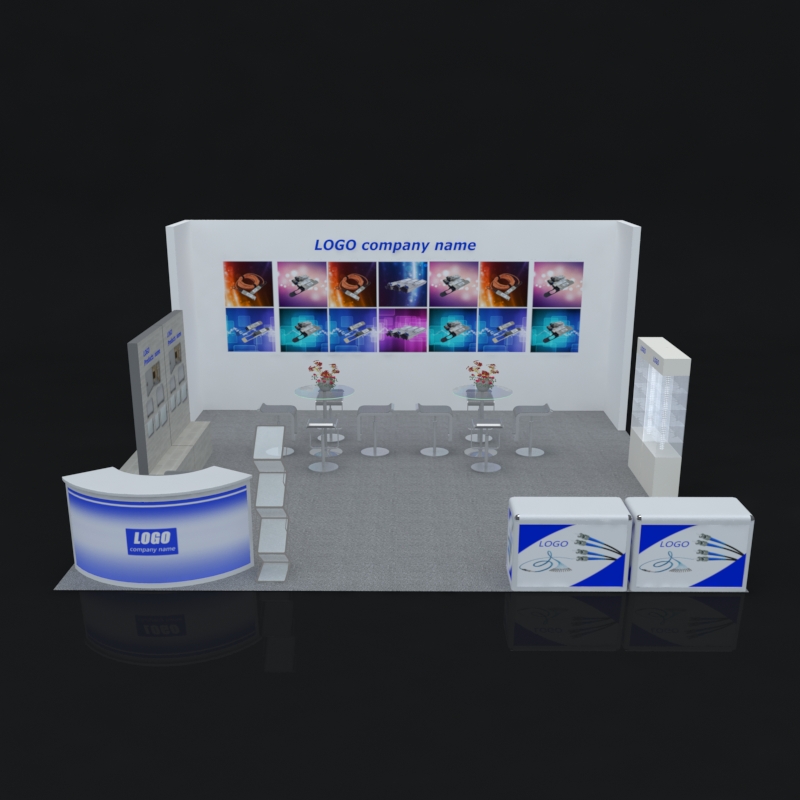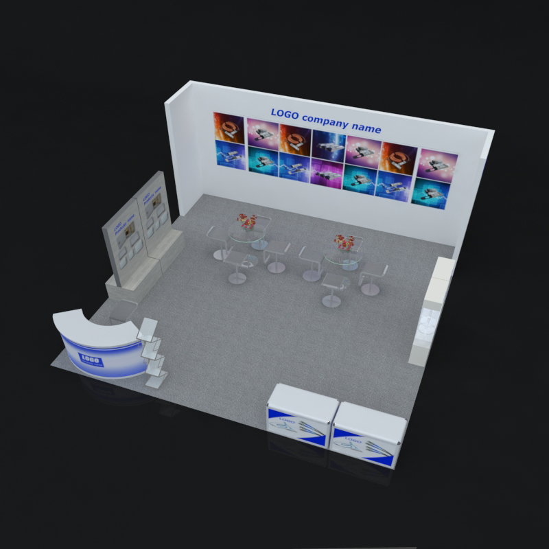 套餐编号: 36-2 包括: 背景墙一块、2个挂产品背景墙、1个接待台、2个展示柜、2张展示台、9把椅子、2张洽谈台、1个资料架、地毯、垃圾桶、照明用电。展台安装及拆除等等。 ***会议室可以自由放在中间或者旁边,可以自由选择灯光颜色。 ***不含画面设计。 场地费: 24,000美元 (下载场地合同) 拐角位(开口)的展位需要另加: 300美元/每个