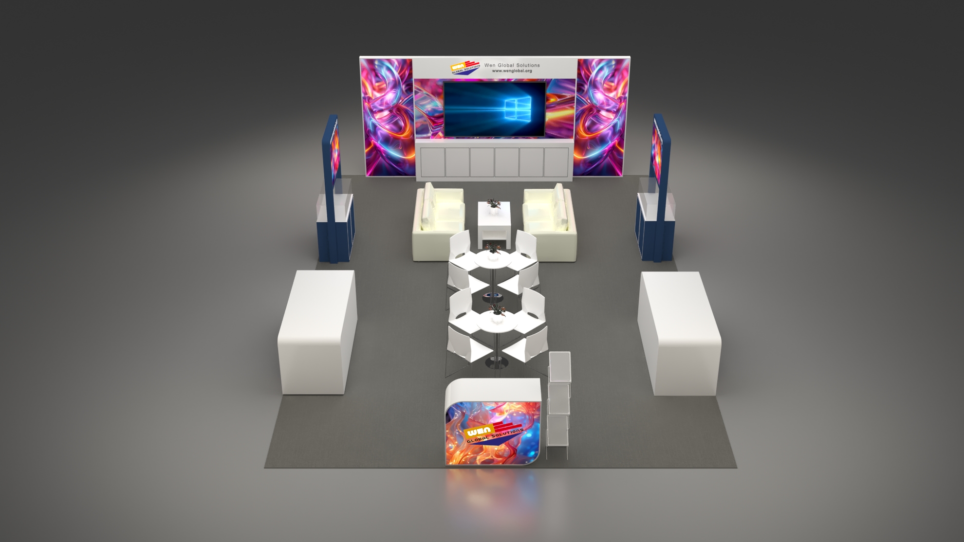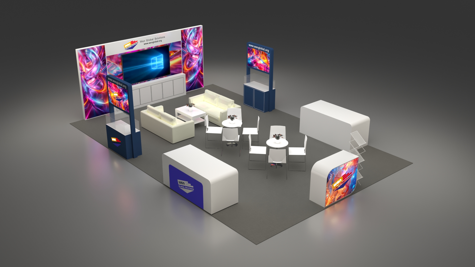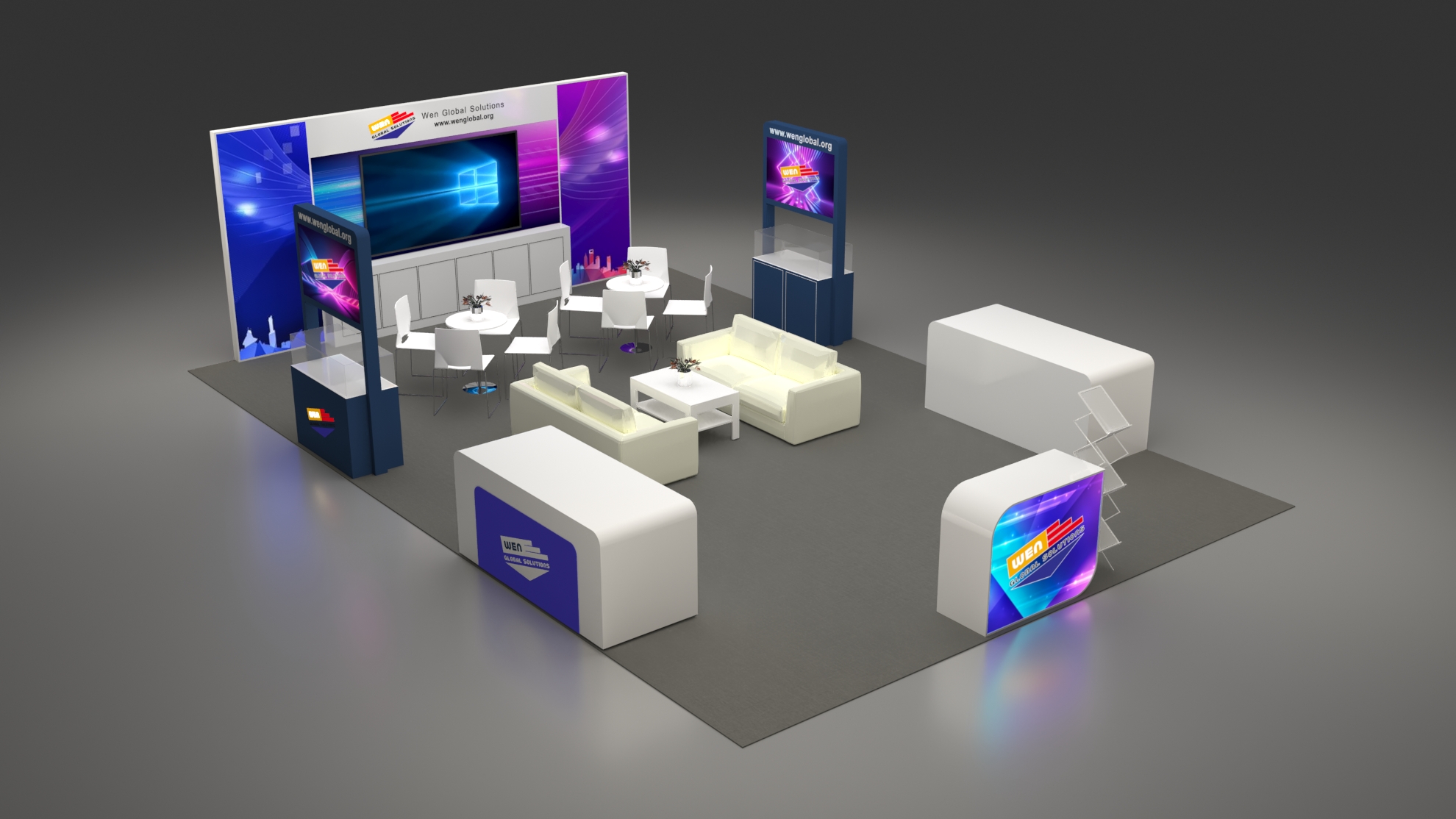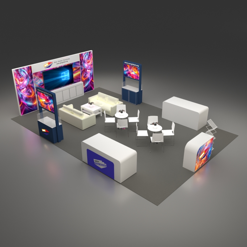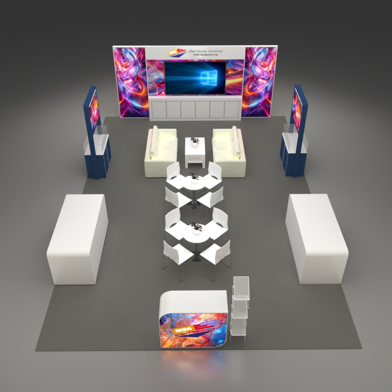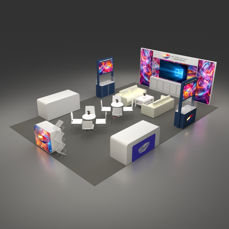 套餐编号: 54-E-1 包括: 木质背景墙+ 储物柜、1台86寸电视机、2张双人沙发、1张咖啡桌、1张接待台、一张吧椅、2个陈列柜、2个展示台、2张洽谈台、8张洽谈椅、一个杂志架、1个垃圾篓、地毯、照明用电、展台安装及拆除等等。 ***不含画面设计。 场地费: 36,000美元(下载场地合同) 拐角位(开口)的展位需要另加: 300美元/每个