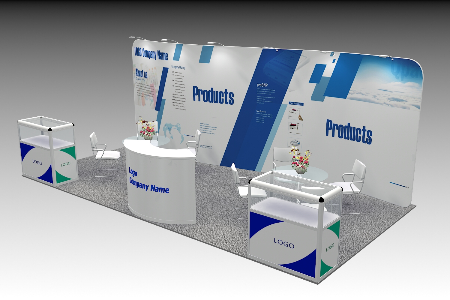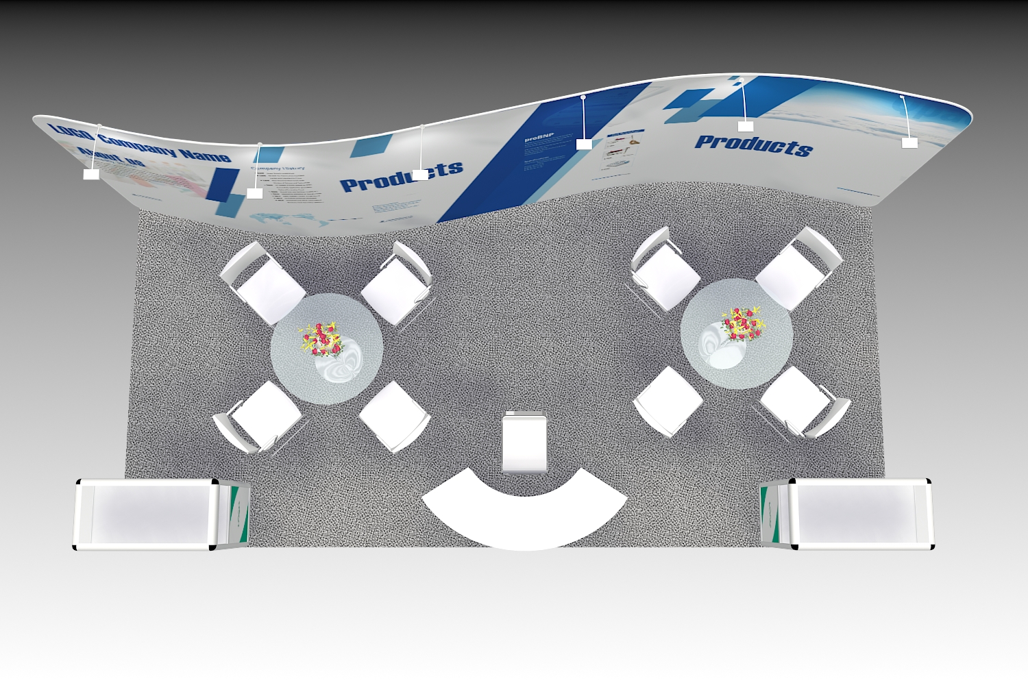 套餐编号: 18T1 包括: 1个拉网展架、2张洽谈台、8张洽谈椅、1个接待台、低玻璃柜2个、6盏射灯、1个垃圾篓、照明用电、地毯、展台安装及拆除等等。 ***不含画面设计。 场地费:12,000美元(下载场地合同) 搭建费: 12,500美元 (下载搭建订单)